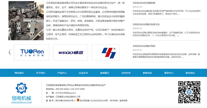 江蘇恒電機械設備有限公司專業從事各類非標自動化設備的研發與生產,是一家集研發、設計、生產、銷售以及售后服務于一體的多元化企業。公司研發基地坐落于江蘇省昆山市北部原創型企業基地,公司具有較強的資源集成和運用能力,雄厚的研發實力、廣泛的營銷網絡、強大的資金實力和項目融資能力,形成了涵蓋設計、研發、制造、系統集成、大型設備成套等方面的完整產業鏈,具備獨特的產業價值和市場競爭優勢。公司一直以來注重技術研發,注重自主知識產權。公司已培育了一支由機械設計工程師、電氣工程師、機械制造工藝工程師為主體的團隊,專門從事自動化設備的研發工作。 公司主要業務包括:軟管裝配與扣壓自動全自動化生產線,密封測試設備(氣密檢測設備,水密檢測設備),電子元件包裝機,非標自動化裝配檢測生產線 。